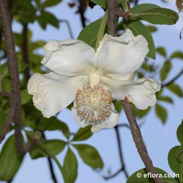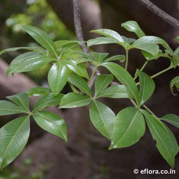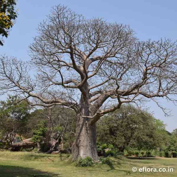 A massive, deciduous tree with a trunk that has an enormous girth, able to grow up to 25 m tall. Leaves are borne at the ends of branches, which are usually divided into 5-7 leaflets attached to a central point. Flowers large, white and pendent on long stalks. Fruits more or less cylindrical. Each fruit is filled with mealy pulp containing many small, dark brown seeds.