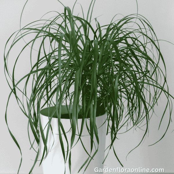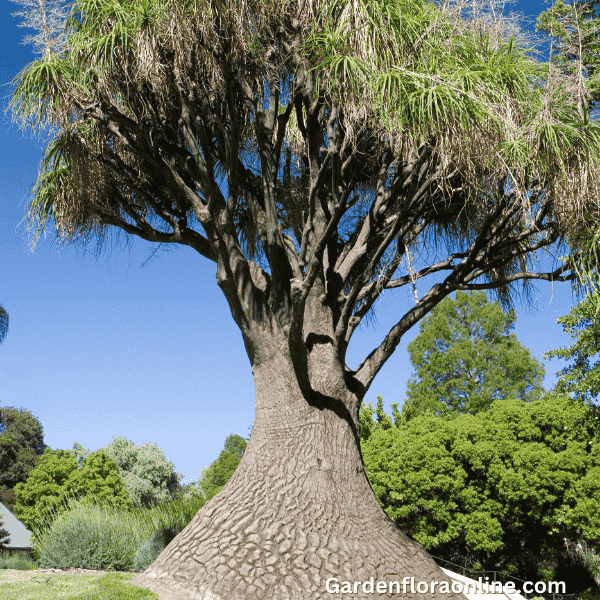 Slow-growing, evergreen succulent featuring distinctive swollen base or caudex for water storage, drought-tolerant. Mature plants reaching up to 4.5–9 m in height outdoors, typically much smaller when grown indoors. Leaves long, slender, arching, measuring up to 1–2 m, giving graceful, cascading appearance; leathery, dark green, densely clustered at top of trunk, resembling ponytail. Trunk usually solitary, with smooth, grey bark, occasionally producing offsets near base. Flowers, small, white or cream, arranged in large, branched panicles.